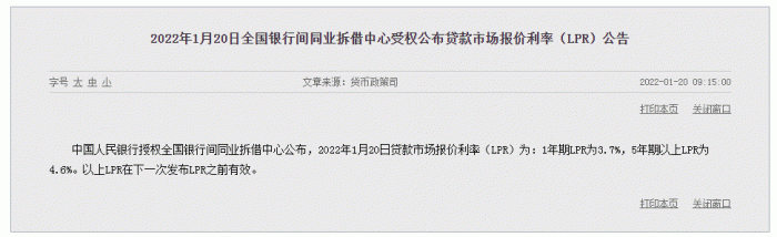 1月20日上午,中国人民银行授权全国银行间同业拆借中心公布,2022年1月20日贷款市场报价利率(LPR)为:1年期LPR为3.7%,5年期以上LPR为4.6%。以上LPR在下一次发布LPR之前有效。