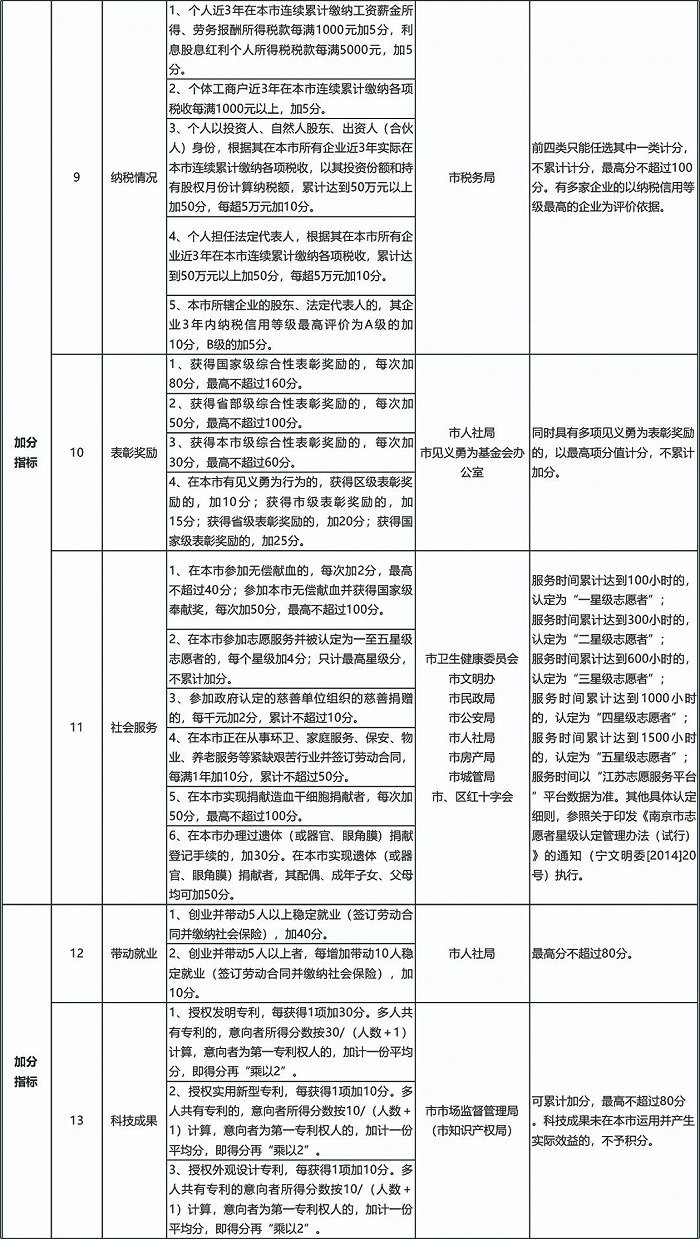 三、重大变化在苏州市参加城镇职工社会保险的,视为在南京市缴纳并赋分;在苏州市居住的,视为在南京市居住并赋分。积分落户指标由基础指标、加分指标和减分指标组成,累计积分达到100分,即符合落户条件。基础指标包括缴纳城镇职工社会保险、连续居住年限。(一)根据意向者参加城镇职工社会保险缴费情况按月赋分。(二)根据意向者在本市居住情况按月赋分。(三)在苏州市参加城镇职工社会保险的,视为在南京市缴纳并赋分;在苏州市居住的,视为在南京市居住并赋分。