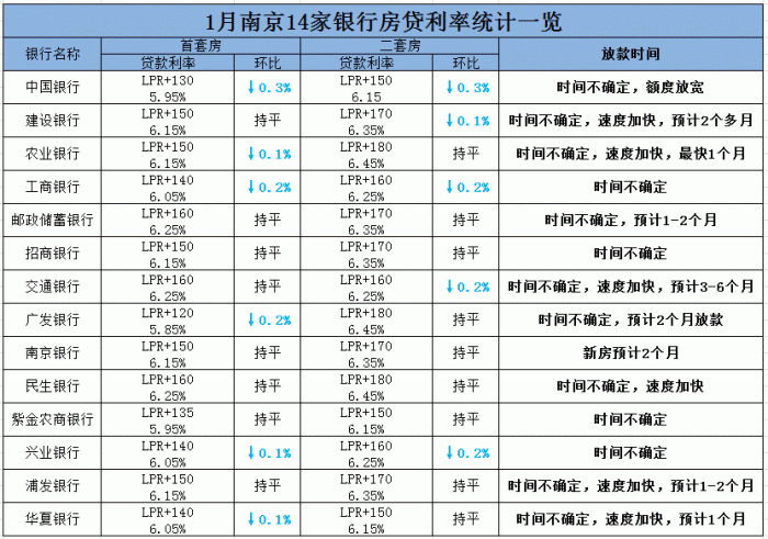 根据本站1月统计的南京14家银行房贷利率表格显示: