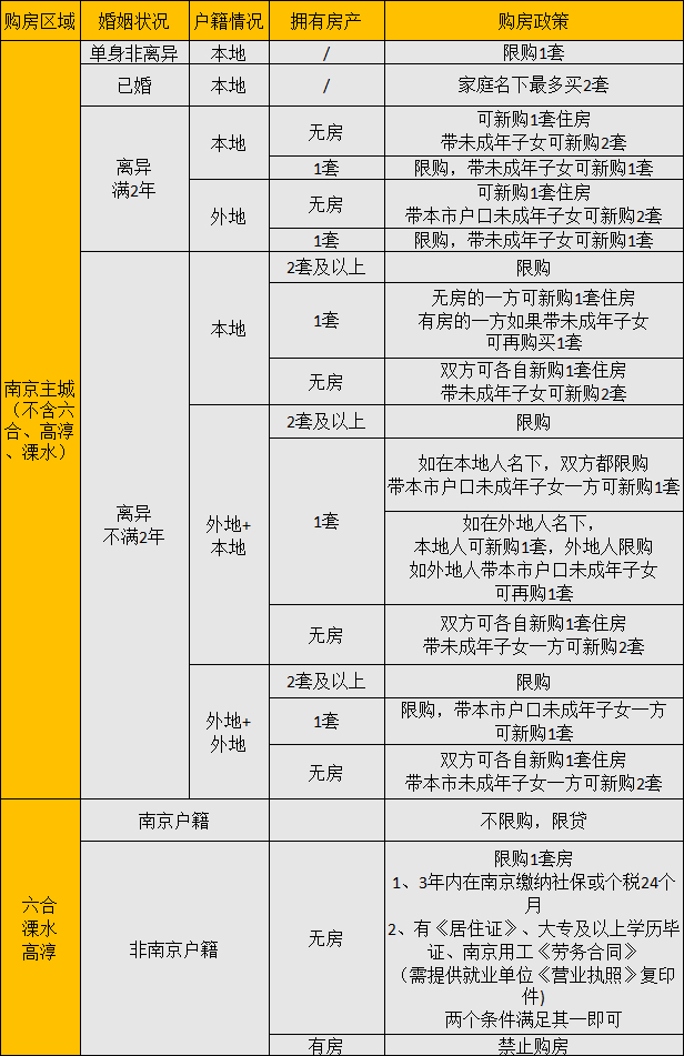 值得注意的是:1.南京主城(不含六合、高淳、溧水),夫妻离异的,任何一方自离异之日起2年内购买商品住房的,其拥有住房套数按离异前家庭总套数计算。2.六合、高淳、溧水区域,南京户籍不限购,但是要注意是限贷的。3.南京本地限购第三套房(含新房、二手房)4.非南京户籍要购房,所要求的“三年内在南京缴满社保或个税24个月”不可以是补缴的。5.已成年小孩算独立户,离异带未成年小孩算一户家庭。