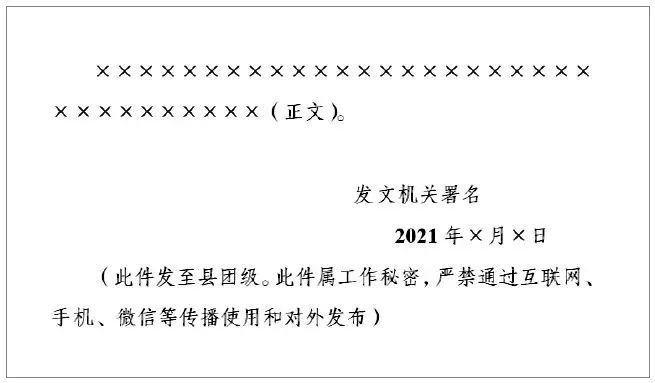 3. 提示保密要求。这种附注主要用于避免公文的阅读者因不了解相关保密管理规定,无意中泄露文件信息的情况,发挥着重要的保密提示作用。如“此件属工作秘密,严禁通过互联网、手机、微信等传播使用和对外发布”。