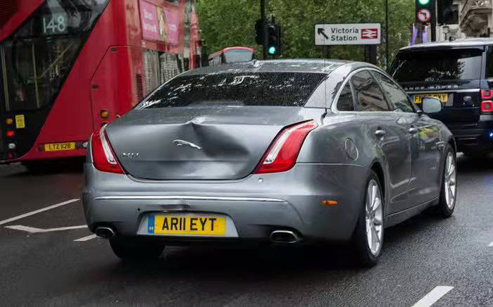 2020年,英国首相约翰逊乘车遇到抗议者,被车队里的后车追了尾,后备箱瘪了个大坑。