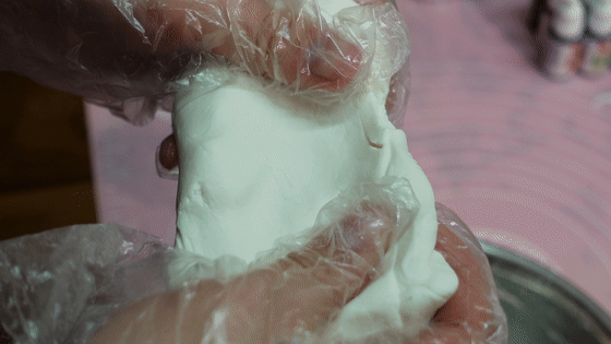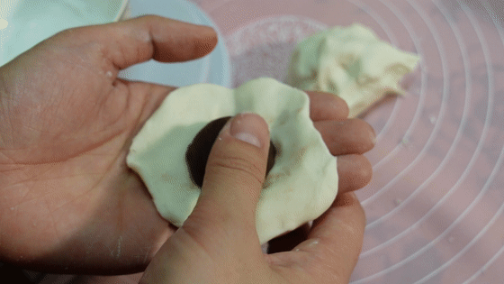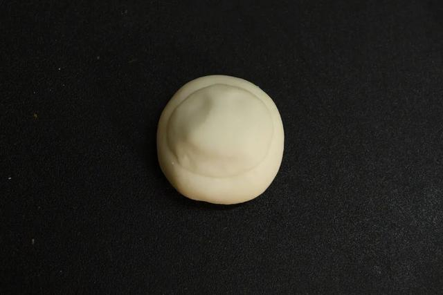 将中间压出凹陷,再取少量白色面团做脸部,按压在一起。轻压眼眶部位,鼻子就凸出来了