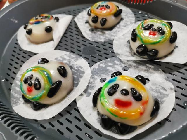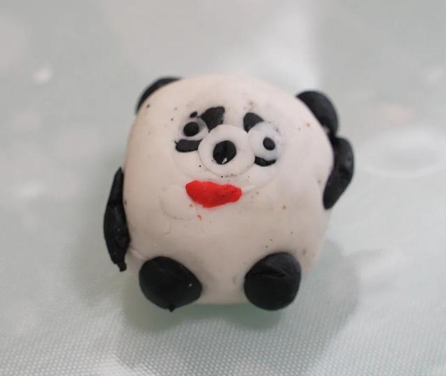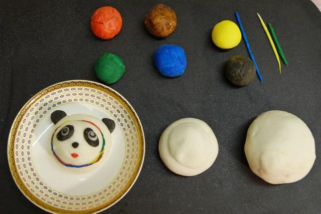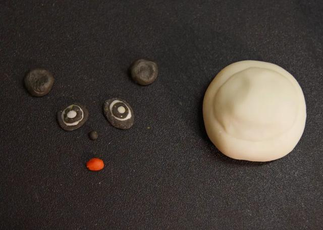少量面团加食用色素揉匀(蔬菜汁调色亦可),黑色捏成椭圆形做眼睛、耳朵,红色做嘴巴部分
