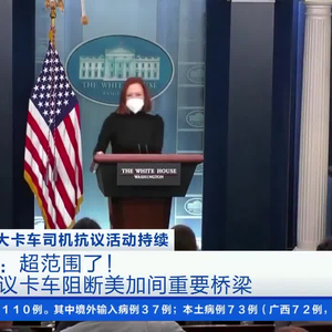 【#加拿大抗议卡车阻断美加间重要桥梁# 美国白宫表态:超范围了】截至当地时间8日,加拿大抗议活动导致连接加拿大温莎与美国底特律的一座名叫“大使桥”的跨国大桥、被阻断。对此,美国白宫新闻秘书普萨基表示,加拿大卡车司机抗议活动已经超出了最初的范围,他们起初只是抗议强制疫苗接种,但现在却阻断了加拿大与美国之间的一个重要桥梁。法新社报道称,“大使桥”是北美地区最繁忙的贸易通道之一,美加之间超过四分之一的商品贸易要通过这座桥,通常情况下,每天有大约4万通勤人员和游客、以及价值超过3亿美元的货物通过。