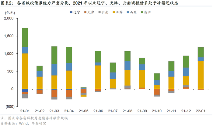 2021年以来,城投融资分化态势显著,天津、云南、辽宁多月城投债呈现净偿还状态,净偿还累计达到898、270、162亿元;与此同时,江苏、浙江、山东月度净融资规模较大,2021年至2022年1月底城投债规模净增5590亿元、3798亿元、2229亿元。