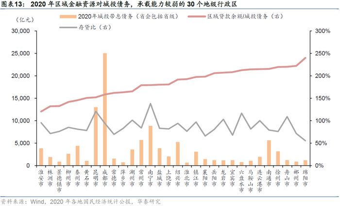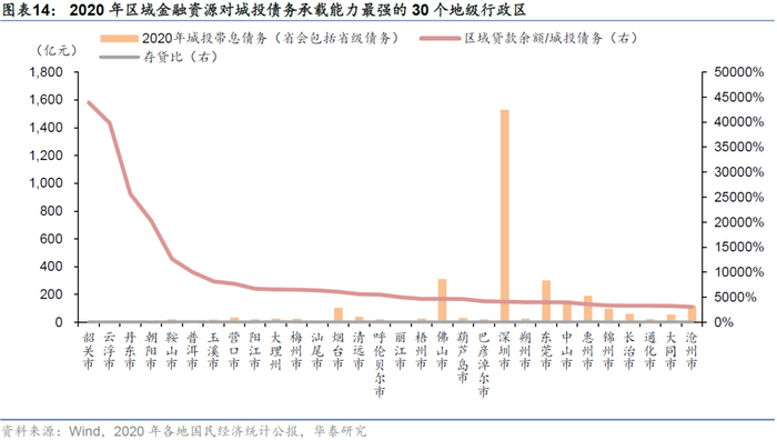 部分地区,区域金融资源对城投债务规模有很强的承载力,即使遇到负面事件和舆情冲击,外部融资受损,区域内金融资源也能起到较好的托底作用。2020年区域贷款余额/城投债务排名最高的30个地级行政区,多数是由于2020年城投债务规模小导致占比小,如通化市、巴彦淖尔市、呼伦贝尔市、营口市、玉溪市、普洱市等东北、内蒙、云南地区,城投平台趋于退出债券市场;也有部分地区如广东云浮市等刚刚进入债券市场。深圳、佛山、东莞、烟台等市城投债务规模大于100亿元,且经济发展水平较好,区域金融资源能较好地承载城投债务。