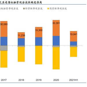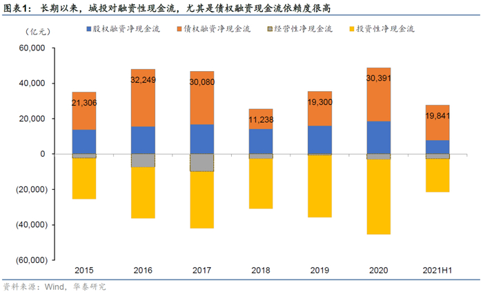 长期以来城投对融资现金流有很高依赖度,信用资质的决定性因素是再融资能力。尽管没有系统性风险,但地方融资日趋规范,15号文管控城投信贷融资,城投发债募资用途可能进一步收紧,债务接续压力不容小觑。而2015年以来,城投经营性净现金流、投资性净现金流持续为负,呈现净流出状态,完全依靠融资性现金流来支撑日常经营、项目投资和还本付息。其中债权融资净现金流尤为重要,近一年一期(2020、2021上半年)债权融资净现金流是股权融资净现金流的两倍左右。因此,当前城投信用资质的决定性因素是融资能力,尤其是债权方面的再融资。