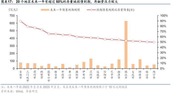 未来一年部分地级行政区债券到期压力大,存在较大的再融资压力。从总体来看,根据Wind数据和我们的统计,2022年2月至2023年2月,地级行政区城投债到期规模合计29203亿元,占存量债券的比例为30.8%;但有部分地级行政区债券到期节奏快,仅计算债券到期规模10亿元以上的地区,有20个地级行政区未来一年超过50%的存量城投债到期,再融资压力较大;其中,吉林市、三门峡市、漯河市、鹤壁市债券到期规模超过存量债券的70%,对债务接续提出很大的挑战。