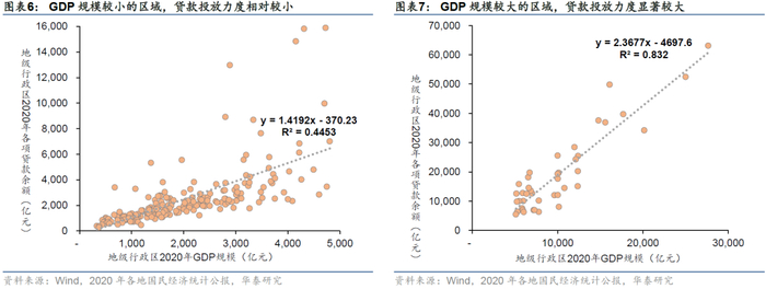 我们将地区按照GDP规模进行分组,各组贷款余额对GDP进行线性回归,斜率显著不同,GDP规模越小的组,斜率越小。我们将地级行政区2020年GDP以5000亿元为分界线分成两组,可以清楚地看到,GDP规模大于5000亿元的41个地区,线性拟合的斜率为2.37;而GDP规模小于5000亿元的211个地区,斜率仅1.42;如果进一步将GDP规模小于2000亿元的119个地级行政区划为一组,斜率下降至1.14。