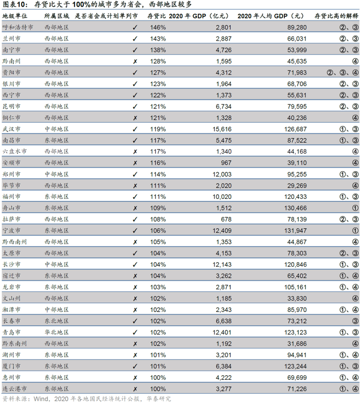 ③中西部、东北省会和计划单列市,在省内形成虹吸格局。如四川的成都,内蒙古的呼和浩特等地区。这些地区自身存贷比高,而省内其他地区存贷比较低,一定程度上是由于金融资源向省内最发达的地区汇聚。