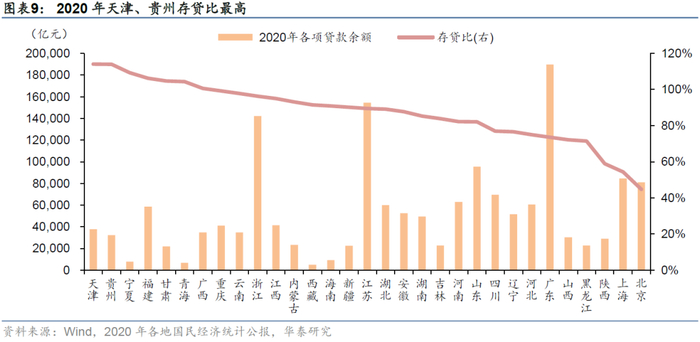 天津、贵州2020年存贷比最高,达到114%,高于100%的还有宁夏、福建、甘肃、青海、广西,金融资源向这些省份流入。31个省份中,天津、贵州存贷比高于其他省份,达到114%,一方面可能与当地所处的经济金融阶段有关,在快速推进城市化进程中对资金的需求体量很大;另一方面,也反映了两个省份债务杠杆较高,需借助外部金融资源来满足资金需求。