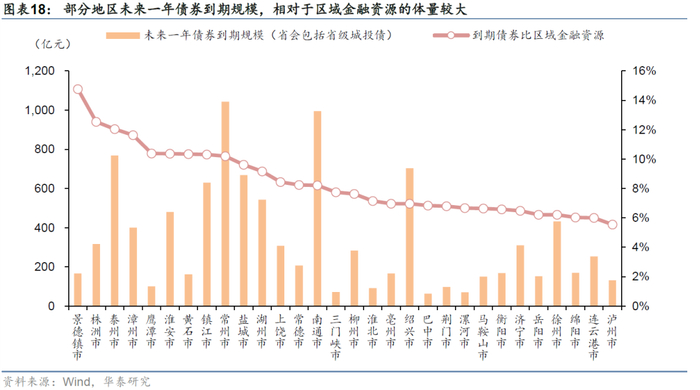 景德镇、株洲、泰州等地区,未来一年债券到期规模相对于区域金融资源的比例较高,如景德镇高达15%,假设外部金融资源收紧,这些地区单纯依赖区域金融资源承接到期债券可能面临压力。这些我们用未来一年城投债券到期规模比区域金融资源(以2020年地区贷款余额代替),测算城投债券到期给地区金融资源造成的压力。篇幅所限,下图仅呈现了到期债券比区域金融资源比例排名前30的地级行政区,需要关注这些地区的流动性风险。