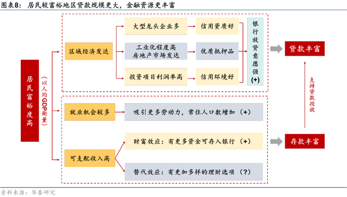 居民较富裕的地区存款也更丰富,能支持更大量贷款投放。从人口的角度,人均GDP较高的地区,经济发展前景相对更好,提供的就业机会也更多,能吸引更多的就业人数和常住人口,银行存款更加充足;从人均储蓄的角度,人均GDP高的地方居民可支配收入较高,储蓄能力也较强。