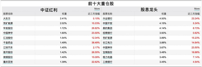 从前十大重仓股对比情况看,中证红利依次是:大东方、兖矿能源、华发股份、中国神华、汇洁股份、千金药业、江铃汽车、首开股份、南钢股份、重庆百货,股息龙头依次是:兴业银行、中国平安、美的集团、招商银行、兖矿能源、长江电力、中国神华、宝钢股份、格力电器、工商银行。两者仅有2只重仓股重合,并且股息龙头前十大重仓股的合计权重占比要更高些。