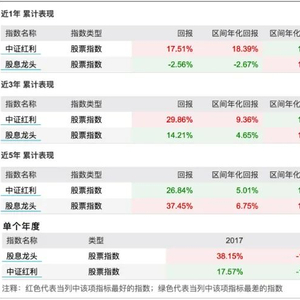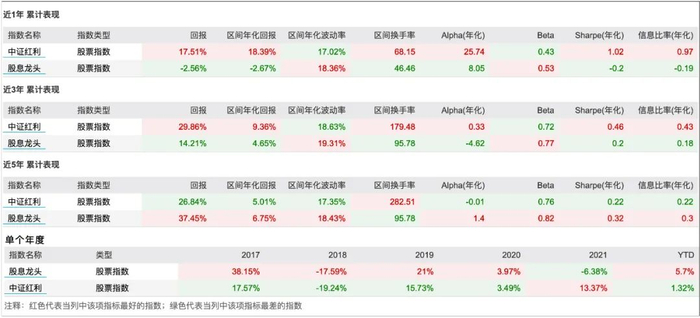 从近1年、近3年以来的表现看,中证红利遥遥领先。中证红利近1年累计上涨17.51%,股息龙头累计下跌-2.56%;中证红利近3年累计上涨29.86%,股息龙头累计上涨14.21%。再拉长到近5年以来的表现看,股息龙头累计上涨37.45%,表现要更好些。不过,从历史单个年度(2017-2021)表现看,股息龙头在2017年、2018年、2019年、2020年的表现,都要比中证红利更好些。2021年却大幅落后,不过今年以来又有所反超。