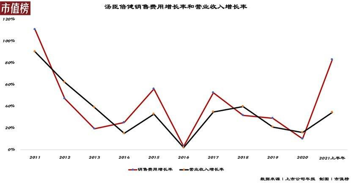 整理2011年至2021年6月汤臣倍健销售费用增长率和营业收入增长率可以看到,汤臣倍健的营业收入增长几乎是在销售费用投入增加下催生的。