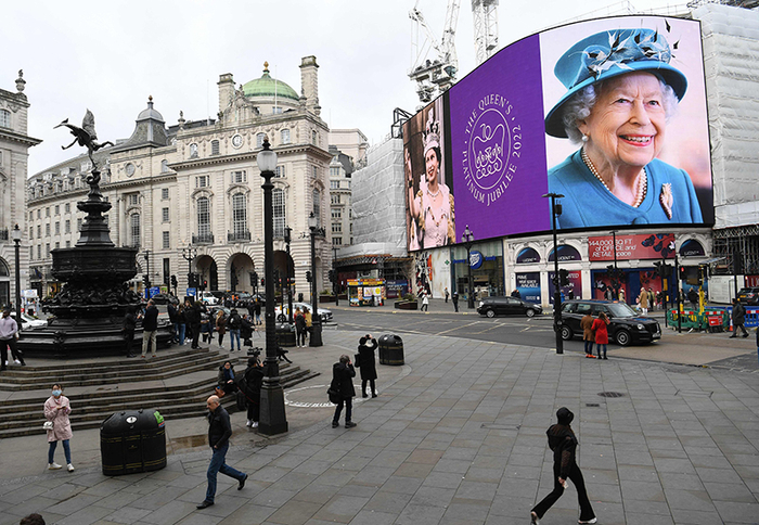 2月6日是她登基70周年的“白金禧”纪念日。当天,英国伦敦的皮卡迪利广场大屏幕上出现了两张照片,一侧是头戴王冠的年轻女王,另一侧则是女王的近照。在这张肖像照里,女王身穿标志性天蓝色圆领西装,同色礼帽点缀着羽毛装饰物。