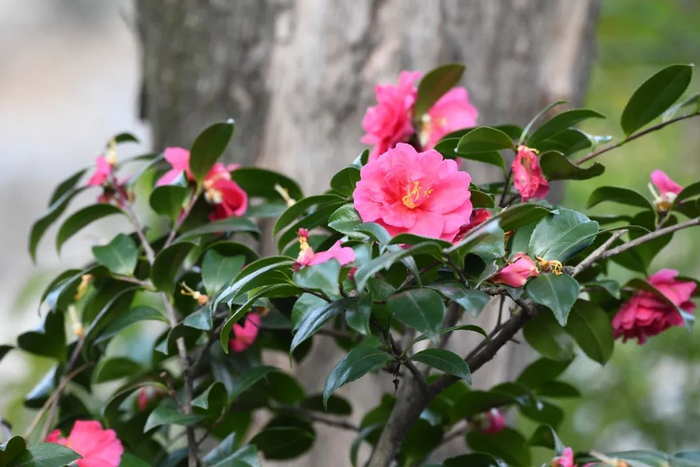茶梅为山茶科山茶属植物,因其叶似茶、花如梅而得名。茶梅体态秀丽、花色艳丽,花期长,可由11月初开至翌年3月。萧肃的冬日里,茶梅不仅装扮了大自然,还为中华蜜蜂和食蚜蝇等昆虫提供了食物来源。