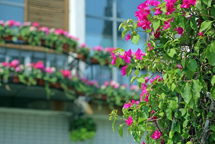 三角梅属于紫茉莉科叶子花属,因其苞片形似艳丽的花瓣,故名“叶子花”,还有簕杜鹃、小叶九重葛、三角花等别称,三角梅花期长、颜色艳丽、观赏价值高。