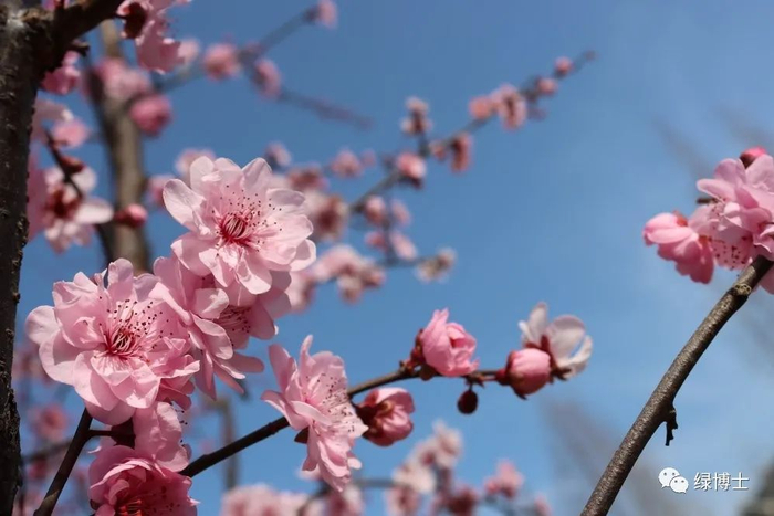 美人梅自然花期为2月底到3月中下旬,可配置在房前、石阶、路边,还可用于道路绿化观赏。
