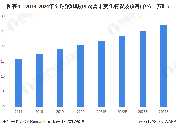 据QY Research分析,2018年全球对聚乳酸(PLA)的需求从2014年的16万吨增加至17.7万吨,2020年达到20万吨左右;LA全生物可降解,在全球白色污染治理过程中扮演着重要角色,预计全球对聚乳酸(PLA)的需求将持续增长,其未来6年复合年增长率为7.3%。