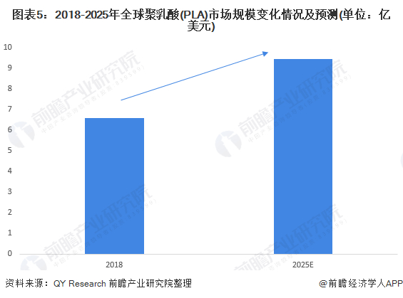 据QY Research分析,2018年全球聚乳酸(PLA)市场规模为6.59亿美元,随着全球禁塑令的逐步实施,PLA的需求量将进一步提升,到2025年,预计整个市场规模预计将达到9.43亿美元。