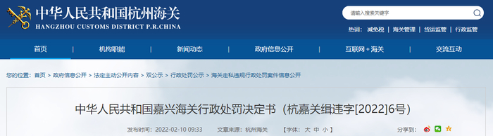 中华人民共和国嘉兴海关行政处罚决定书(杭嘉关缉违字[2022]6号)