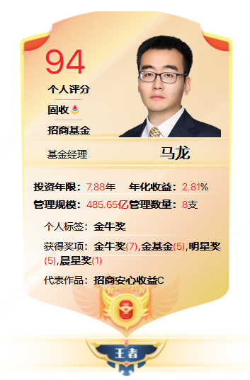 尤其招商基金的马龙,固定收益行业的大满贯得主,获得的荣誉包括七次金牛奖,五次明星基金奖,五次金基金奖,一次晨星奖。