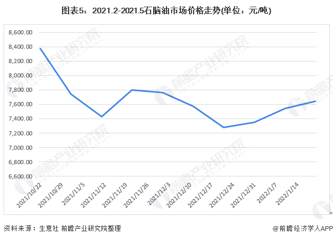 根据生意社价格监控数据,2021年10月以来,我国石脑油价格波动较大,波动范围在7278-8373元/吨之间,截止到2022年1月20日国内地炼石脑油主流出厂均价为7640.75元/吨,较月初价格小幅回落。