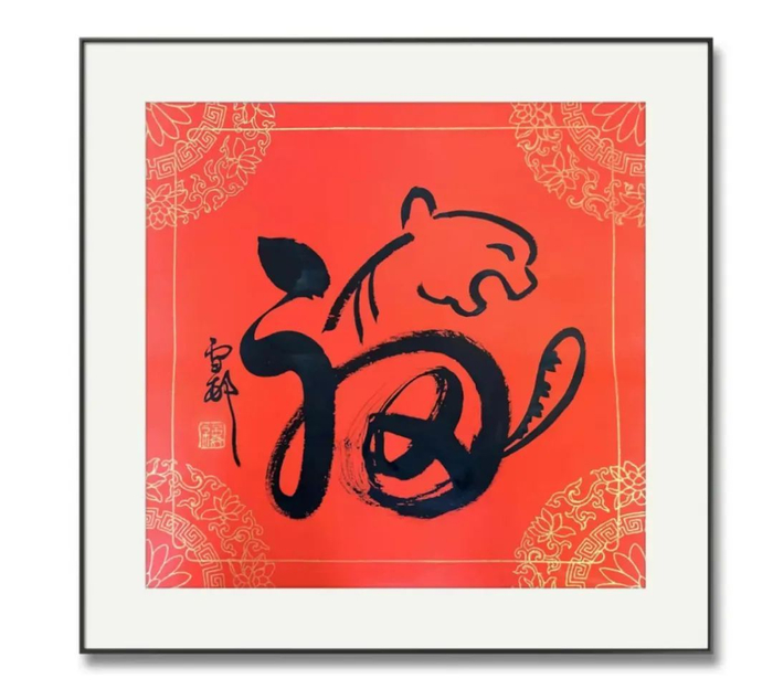 汉字设计也颇见创意。在农历新年到来之际,徐梅创作的“虎福”中,驾“福”狂奔而来的是一个拥有“初生虎仔不畏牛”的可爱的虎宝宝。利用“福”的“示”旁表意和“畐”字表音,她以一笔书将“示”和“田”连成一体,一笔而就,使“福”字的绵延、长寿、幸福、圆满尽现其中,寄托人们对幸福生活的向往,对美好未来的期盼。