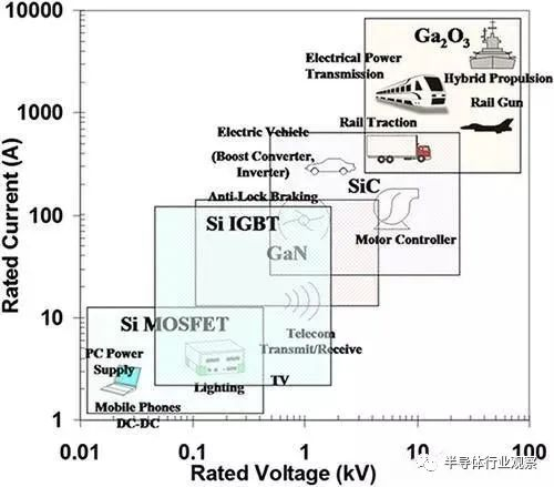 在电流和电压方面的要求:Si,SiC,GaN和Ga2O3功率电子器件的应用如上图,由于其材质的属性的本质区别,导致这以不同衬底制作出来的功率器件会表现出很大的差异,比如以氧化镓为衬底的功率器件就能在相对成本较低的情况下实现第一、二、三代半导体的功率器件功能,由图二也可以看出,以氧化镓为衬底制作出来的功率器件在承受更高电压、电流方面就具有很大的优势,据统计,如果将中国低效电机改成使用氧化镓等高功率半导体材料的高效电机,每年可节约900+亿度电,实现450+亿元(RMB)的节电效益,形成500+亿元(RMB)的增加值,可以有效的助力碳中和、碳达峰的国家政策。