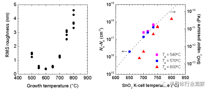 以上是材料属性的基础对比,对于更深层面的功率器件的表皮晶圆需要特征:(1)表皮表面的平坦度;(2)低载流子浓度区域的浓度控制;氧化镓的这方面特性,被日本Novel Crystal Technology研究人员经过实验进行了定性,其使用臭氧MBE方法作为表皮沉积方法,晶体平面方位,掺杂剂优化了种子、生长温度、原料供应量等生长参数。例如,图1显示了表面平整度与生长温度之间的关系,以及载体浓度与掺杂原料电池温度之间的关系。这些允许在1nm或更低的表面粗糙度和1016cm-3的低载波浓度区域进行控制,以满足电源器件的表面粗糙度,此项结果证明,氧化镓与第一、二代功率半导体材料具有明显的优势,甚至对比于第三代半导体碳化硅都具有明显的优势。