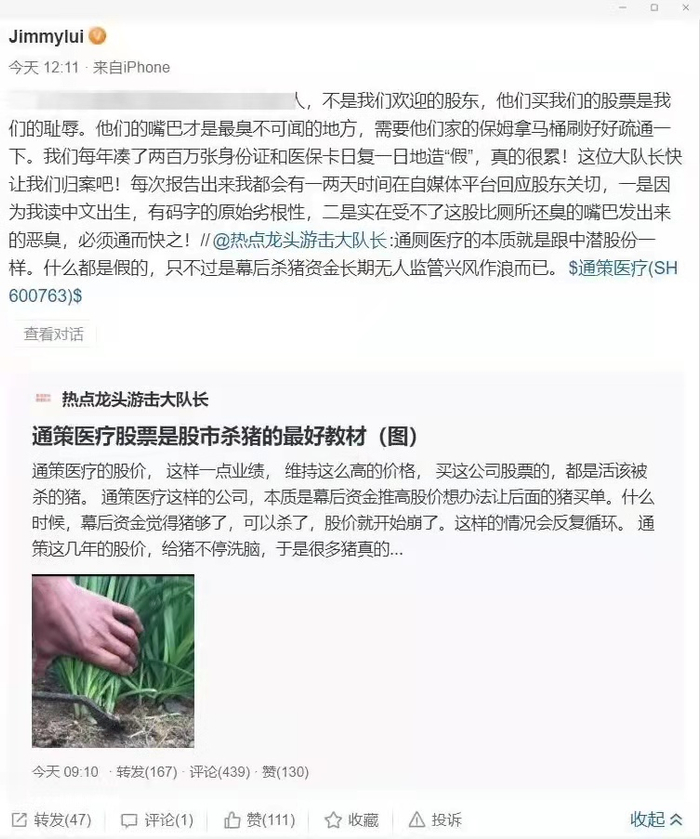 在这样的情况下,部分投资者网友抨击了通策医疗。而在平台上,用户“Jimmyliu”(经平台认证为通策医疗董事长吕建明)言辞激烈,回击网友们。