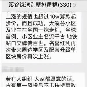 根据网络上流传的微信群截图,这个提议众筹建地铁的小区,就是位于杭州良渚的溪谷岚湾,其中一位居民在微信群中提出,愿意捐60万人民币“打底”,为使小区成为“地铁小区”献出一份力。