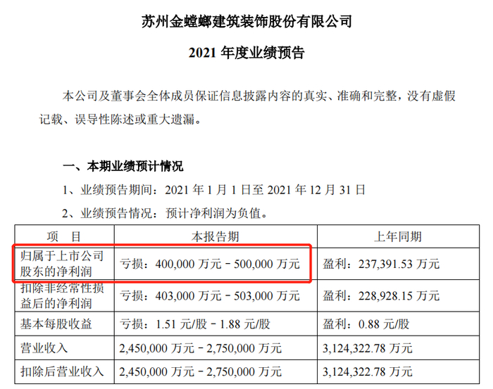“建筑装饰第一股”金螳螂即业绩变脸。这家营收超300亿的装饰巨头,节前已公告,由盈转亏,2021年预计亏损40至50亿元。