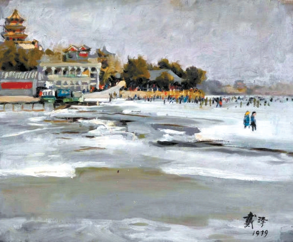 1979年,任教于中央美术学院的戴泽创作的油画《颐和园后湖》,在构图上类近于宗其香,远景中的滑冰者也是以点笔为之,但是画面更追求一种大笔触的表现,尤其是近景的冰面,极富形式意味。而1978年任教于北京师范学院、曾留学比利时和法国的油画家李瑞年创作的油画《什刹海冬天》,则更像是对古元的回应。在这件作品中,李瑞年透过近景中9棵树的间隙,刻画了在冰面上或滑冰、或打冰球嬉戏的人群,有意思的是,这些点景式的人物都是以较为明亮的色彩描绘衣、裤,尤为生动活泼,使画面中萦绕着迎来改革开放新时期的欢欣气息。