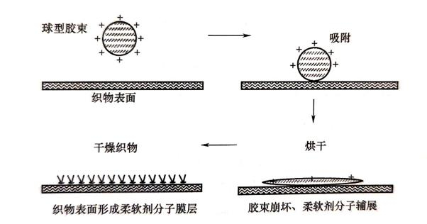 柔顺剂的结构上,一端是带正电的亲水基团,在水中的溶解性好;另一端是亲油基团,在水中的溶解性差。当柔顺剂分散在水中后,溶解性差的亲油端会聚在一起。