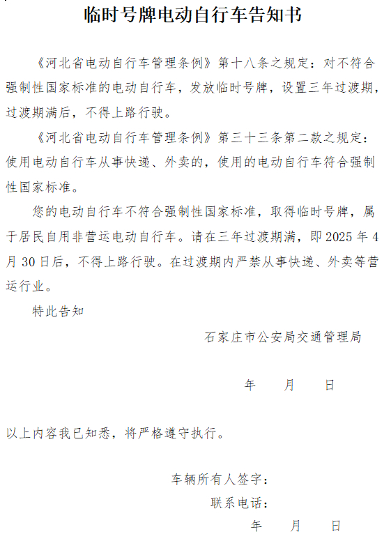 (四)对取得临时号牌的,电动自行车所有人须签署《临时号牌电动自行车告知书》(见附件4)。