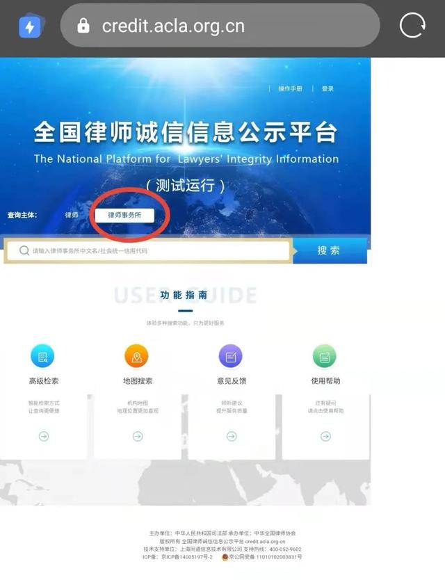 返回首页,选择“律师事务所”,在搜索框中输入律所名称,点击查询