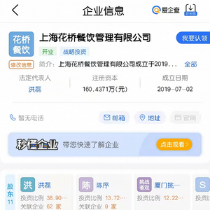 目前,上海花桥已对外投资成立20余家餐饮公司,分布在江苏、浙江、广东等地。