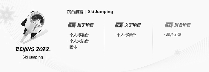 滑雪者两脚各绑一块专用的雪板,板长2.30-2.70米,宽11.5厘米,板底有3-5条方向槽。比赛时运动员不用雪杖,不借助任何外力,以自身体重从起滑台起滑,经助滑道获得110公里/小时的高速度,于台端飞后,身体前倾和滑雪板成锐角,两臂紧贴体侧,沿自然抛物线在空中滑翔,在着陆坡着陆后继续自然滑行到停止区,然后根椐从台端到着陆坡的飞行距离和动作姿式评分。