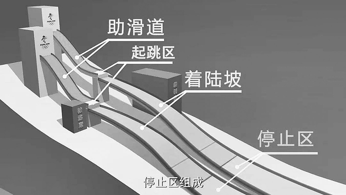 跳台滑雪的基本技术分为5个部分:助滑、起跳、空中飞行、着陆、终止区滑行。
