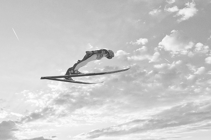 运动员只有保持大胆、沉着、稳定和善于控制雪板的空中飞行姿势,才能获得理想的成绩,为了减少前进的空气阻力和增加升力,运动员的上体应充分伸展,身体应与双滑雪板平行,与水平面成8°-10°的倾斜角并维持平稳,上体与下肢间稍有曲折,两雪板平行并与脚底呈锐角上仰,两臂伸直贴放于身体两侧,沿着抛物线轨迹向前飞落。