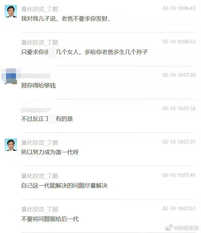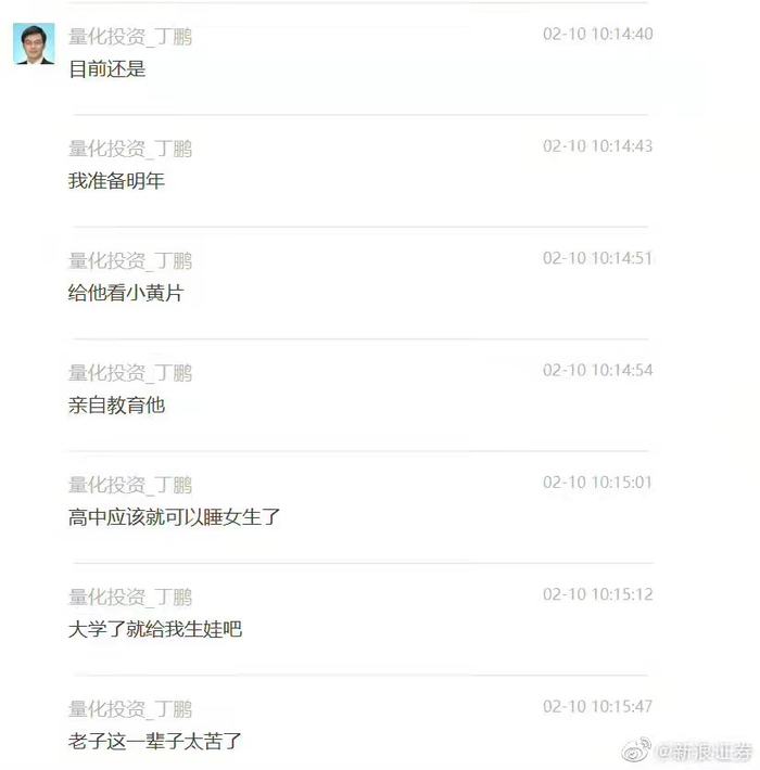 2月10日,有关知名量化投资人丁鹏的聊天记录引发热议。谈及孩子教育问题,丁鹏表示,“我对我儿子说,老爸不要求你发财,只要求你多*几个女人,多给你老爸多生几个孙子。”