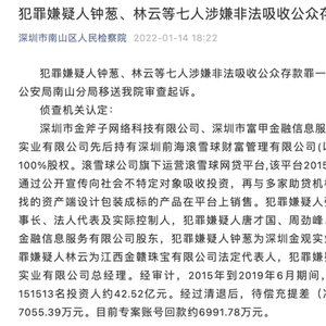 通报提到,犯罪嫌疑人张开兴为滚雪球公司董事长、法人代表及实际控制人,犯罪嫌疑人唐才国等三人为富甲金融股东,犯罪嫌疑人钟葱为金观实业实控人,犯罪嫌疑人林云为江西金赣珠宝有限公司(下称“金赣珠宝”)法定代表人,犯罪嫌疑人邹晓晖为金观实业总经理。合计7人涉嫌非法吸收公众存款罪一案,由深圳市公安局南山分局移送检察院审查起诉。