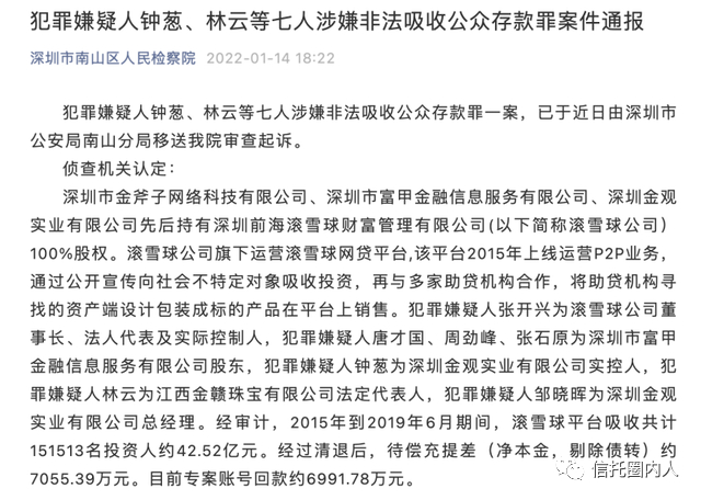近日,深圳市南山区人民检察院发布公告,P2P滚雪球历届股东实控人等7人涉嫌非法吸收公众存款案,由深圳市公安局南山分局移送检察院审查起诉。