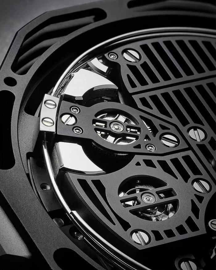 该系列表壳直径为45毫米,刺青图案交替叠加出现在表壳和表圈上,机械装置和圆盘指针则采用了几何刺青图案,该图案一直蔓延至橡胶表带。得益于这种几何结构设计,透过镂空表盘和透明表背,HUB1240表厂自制自动上链Unico计时机芯的机械之美一览无遗。