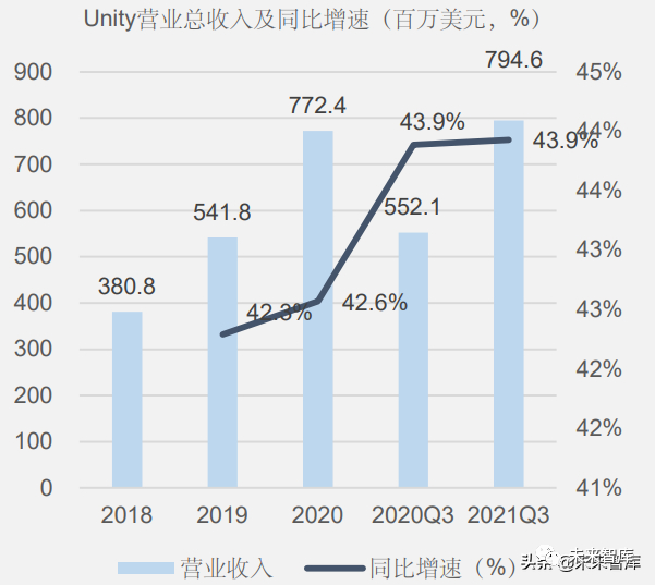 Unity 2020年收入为7.72亿美元,同比增长42.6%,2021前三季度收入为7.95亿美元,同比增长43.9%,2019~2020年收入同比增速均超过40%。