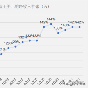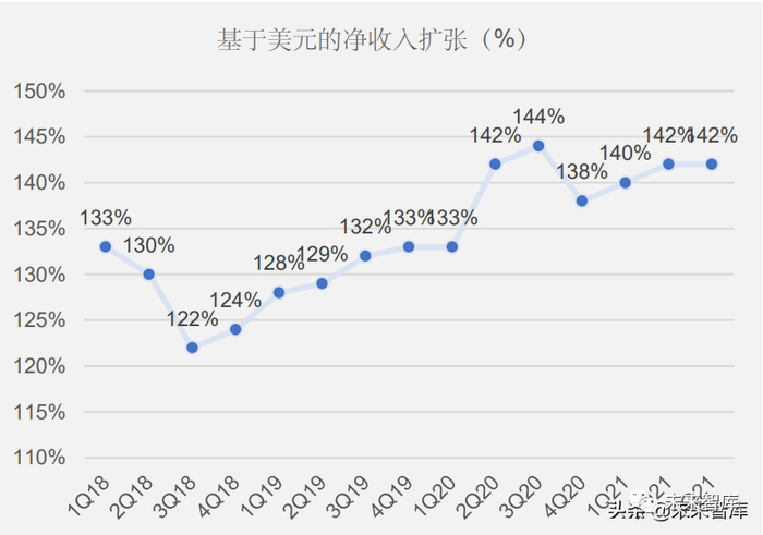 根据公司自2018Q1统计的,基于美元的净收入扩张率(计算方式:同一组客户当下12各月收入/过去12各月收入),2018Q3以来呈现 持续提升态势,2021Q3已经达到142%,较0218Q3时的低点提升了20个百分点。
